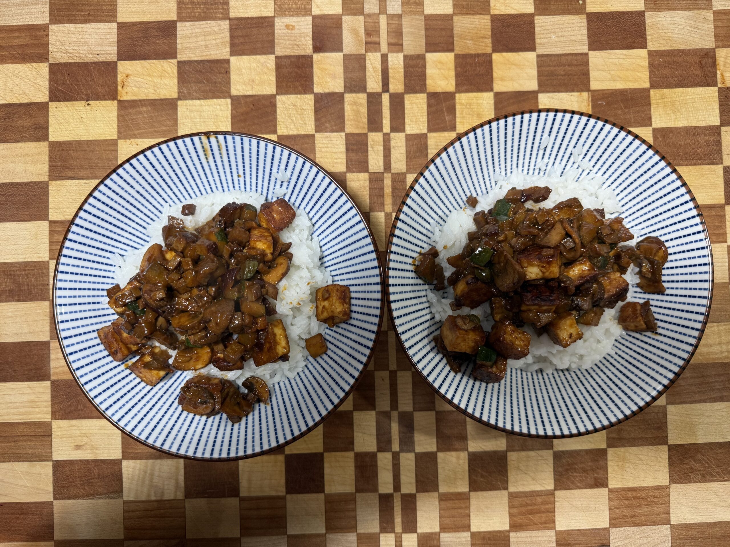 Du kannst dann das Gericht anrichten, erst etwas Reis und dann das Gemüse darüber.
