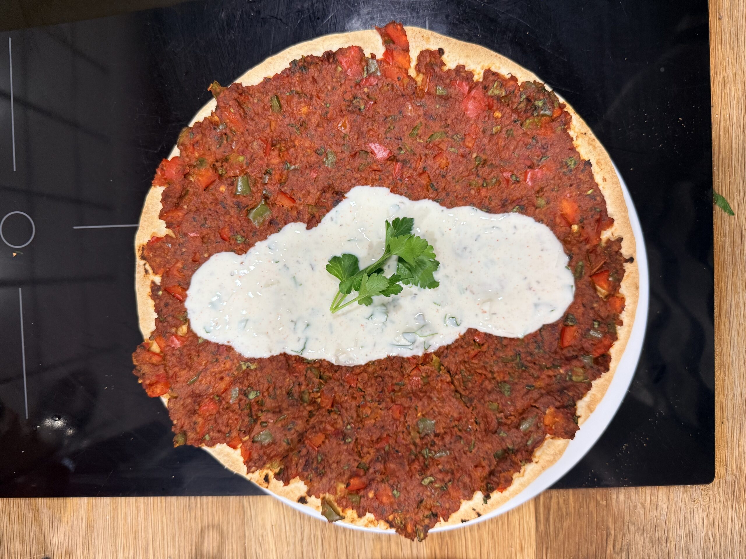Das Gericht ist einfach so, so lecker. Ich bin eigentlich kein großer Fan von veganem Hack aber zu diesem Gericht passt es wahnsinnig gut. Das Gericht ist eine vegane Lahmacun Variante. Lahmacun ist ein türkisches oder armenisches Pizza, die mit verschiedenem Gemüse gegessen wird. Sie wird direkt nach dem backen warm gegessen. Zu meinem Rezept habe ich zum Lahmacun ein Joghurtdip serviert. Das Rezept reicht für vier vegane Lahmacun.